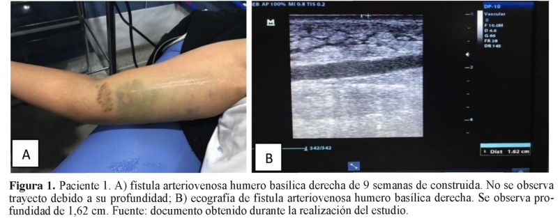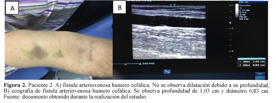 En el paciente 2, con fístula arteriovenosa humero cefálica, que llevaba 4 meses de construida y en el que, a pesar de este tiempo, la FAV nativa no había logrado una dilatación visible para poder ser canulada por su profundidad, al realizar la ecografía se observó que estaba a una profundidad de 1,03 cm, algo muy inusual en este tipo de fístula donde el trayecto cefálico es muy superficial. En ocasiones estas situaciones podrían sugerir o considerarse un fracaso de la maduración, el cual es un problema importante. De este modo, se define la falla temprana como una FAV que no se puede utilizar para diálisis o que falla dentro de los 3 meses de uso8 ,9, y que además no correspondía a la situación de este paciente, ya que por ecografía se pudo visualizar un adecuado trayecto y diámetro de la vena. Por lo general, la FAV que no ha podido madurar tiene un problema anatómico de algún tipo que puede identificarse mediante un examen físico y confirmarse a través de imágenes.