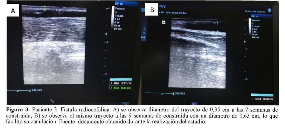 En los casos de fístula HB y fístula HC, utilizando el ecógrafo como guía, la canulación del trayecto venoso se realizó sin dificultad y sin complicaciones, generando satisfacción y mayor seguridad por parte del personal de enfermería y hacia los pacientes. En el paciente 3 la fístula radio cefálica no alcanzó la maduración adecuada y el diámetro mayor de la fístula menor fue de 0,4 cm, por lo que se decidió postergar su canulación y continuar con ejercicios de maduración y seguimiento ecográfico. A las 9 semanas se observó una adecuada dilatación del segmento venoso (>0,4 cm), lográndose la canulación de la fístula.