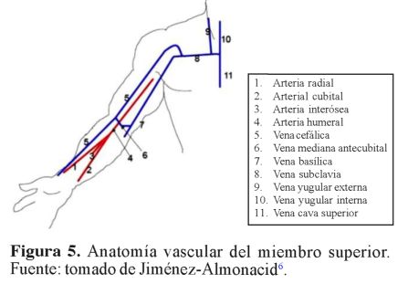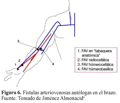 Es importante resaltar que tanto el personal médico como el de enfermería deben tener conocimiento de la anatomía de los vasos del miembro superior y el tipo de fístulas nativas que se pueden presentar en esta extremidad, los cuales se muestran en las Figura 5 y 6.