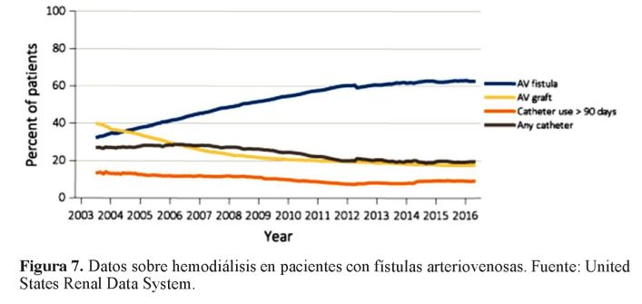 A mayo del 2016, en EE. UU el 62,7 % de los pacientes prevalentes en hemodiálisis estaban usando una FAV según datos del United States Renal Data System10 (figura 7).