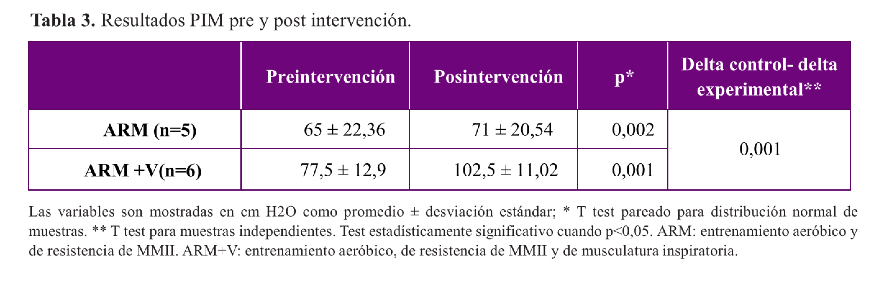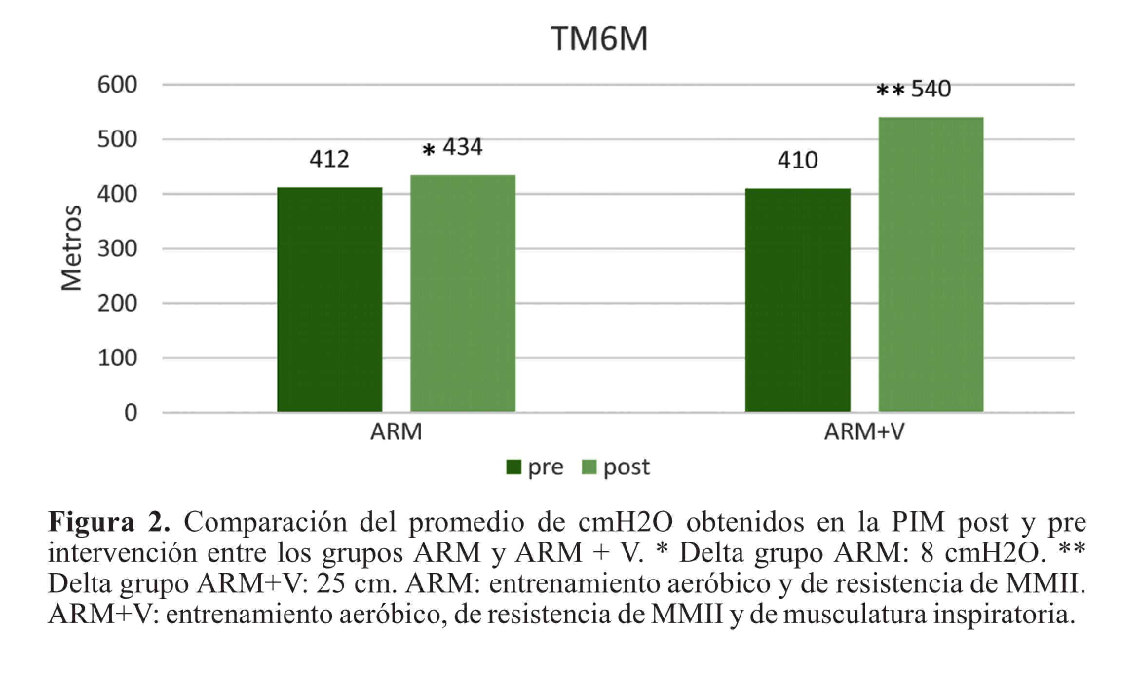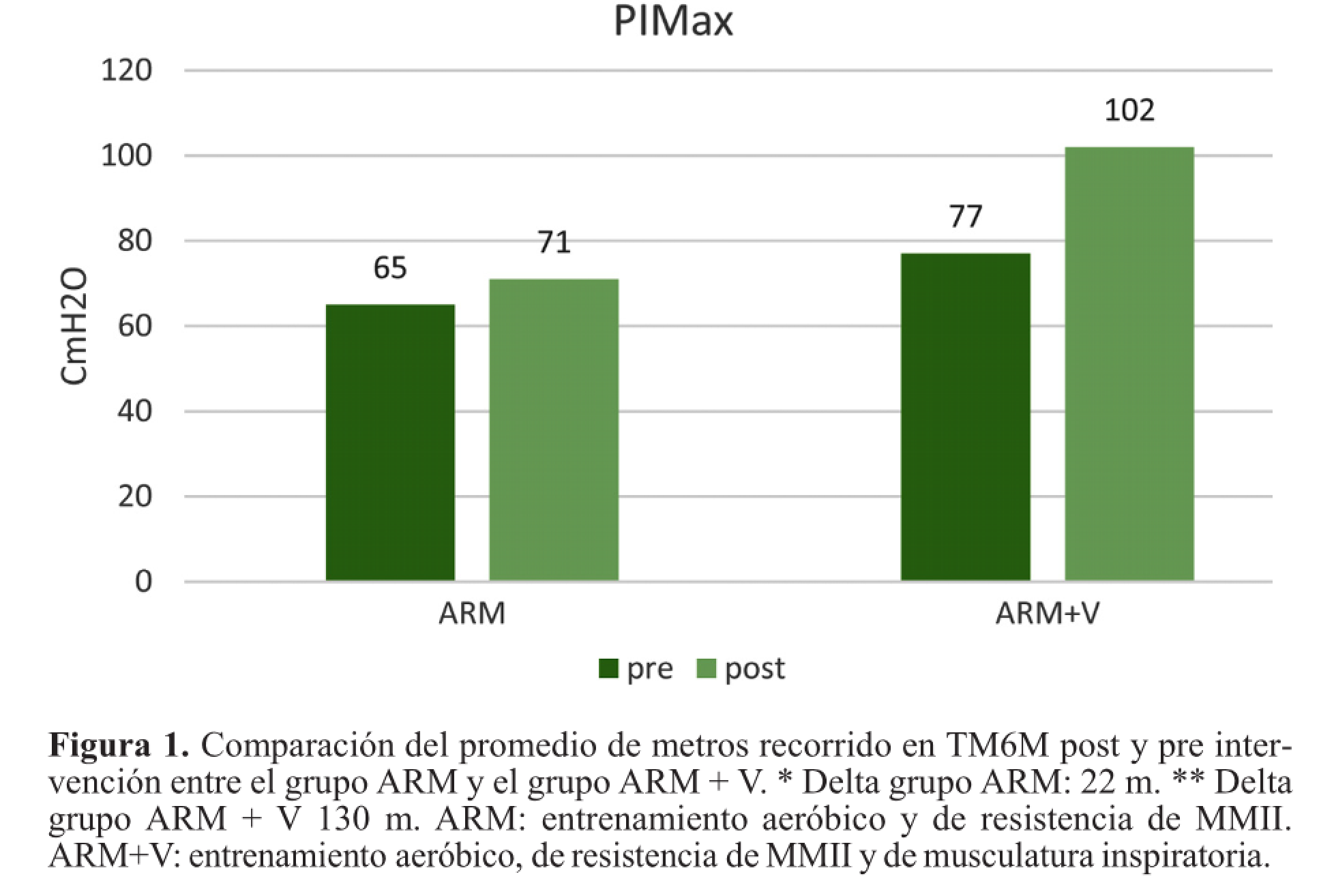 Las variables son mostradas en cm H2O como promedio ± desviación estándar; * T test pareado para distribución normal de muestras. ** T test para muestras independientes. Test estadísticamente significativo cuando p<0,05. ARM: entrenamiento aeróbico y de resistencia de MMII. ARM+V: entrenamiento aeróbico, de resistencia de MMII y de musculatura inspiratoria.