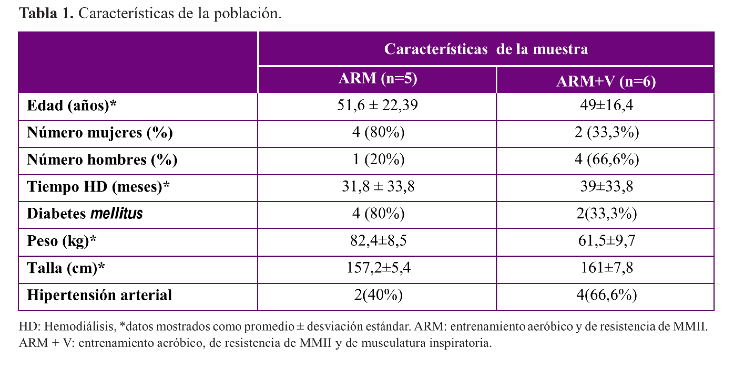 La muestra final del estudio comprendió 11 pacientes con ERC pertenecientes a la Unidad de Diálisis del Hospital Base de Valdivia (mujeres 54,5% y hombres 45,5%, con un promedio de edad de 50,8 ± 18,3 años) que se encontraban bajo tratamiento de HD tres veces por semana durante 35,7 ± 32,7 meses. Los pacientes fueron divididos en dos grupos, donde seis conformaron el grupo con entrenamiento aeróbico, de resistencia de MMII y ventilatorio (ARM+V), mientras que cinco pertenecieron al grupo con entrenamiento aeróbico y de resistencia de MMII (ARM). La tabla 1 muestra las características de cada grupo. La evolución en el rendimiento del TM6M pre y post intervención de ambos grupos se ve reflejada en la tabla 2.