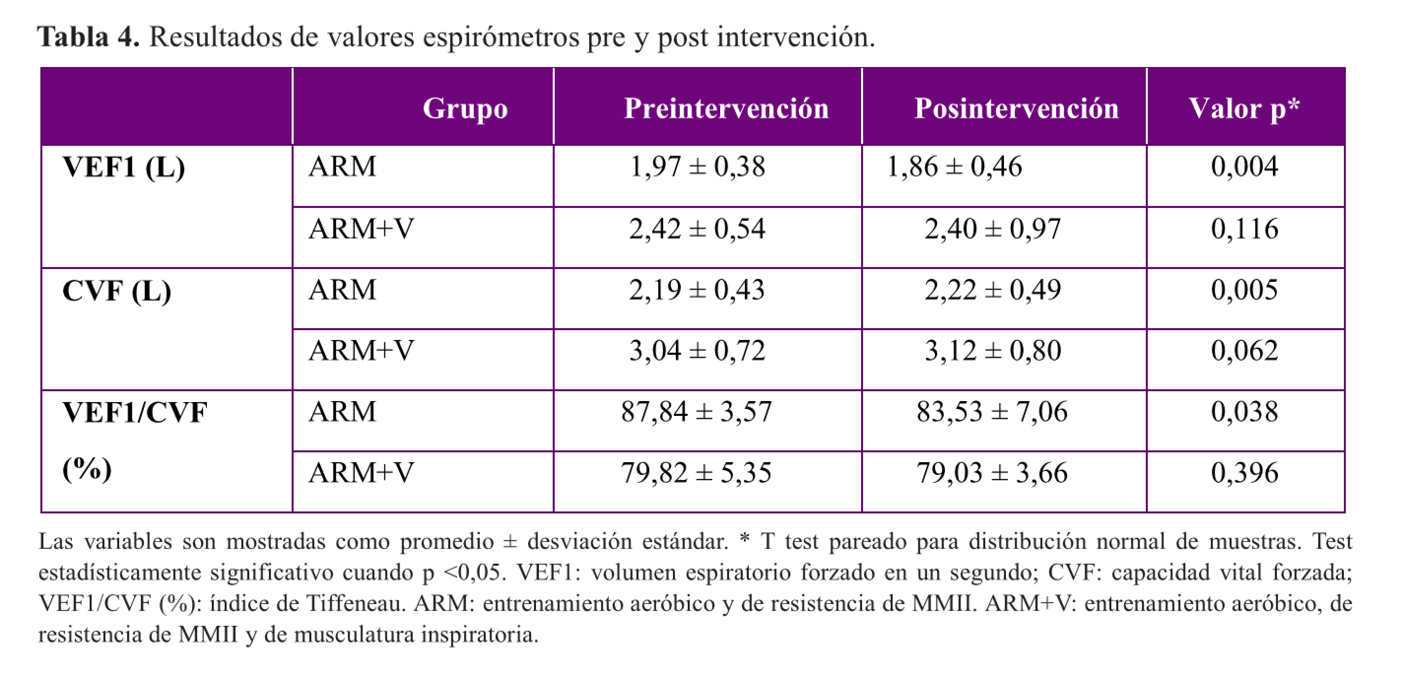 Las variables son mostradas como promedio ± desviación estándar. * T test pareado para distribución normal de muestras. Test estadísticamente significativo cuando p <0,05. VEF1: volumen espiratorio forzado en un segundo; CVF: capacidad vital forzada; VEF1/CVF (%): índice de Tiffeneau. ARM: entrenamiento aeróbico y de resistencia de MMII. ARM+V: entrenamiento aeróbico, de resistencia de MMII y de musculatura inspiratoria.
